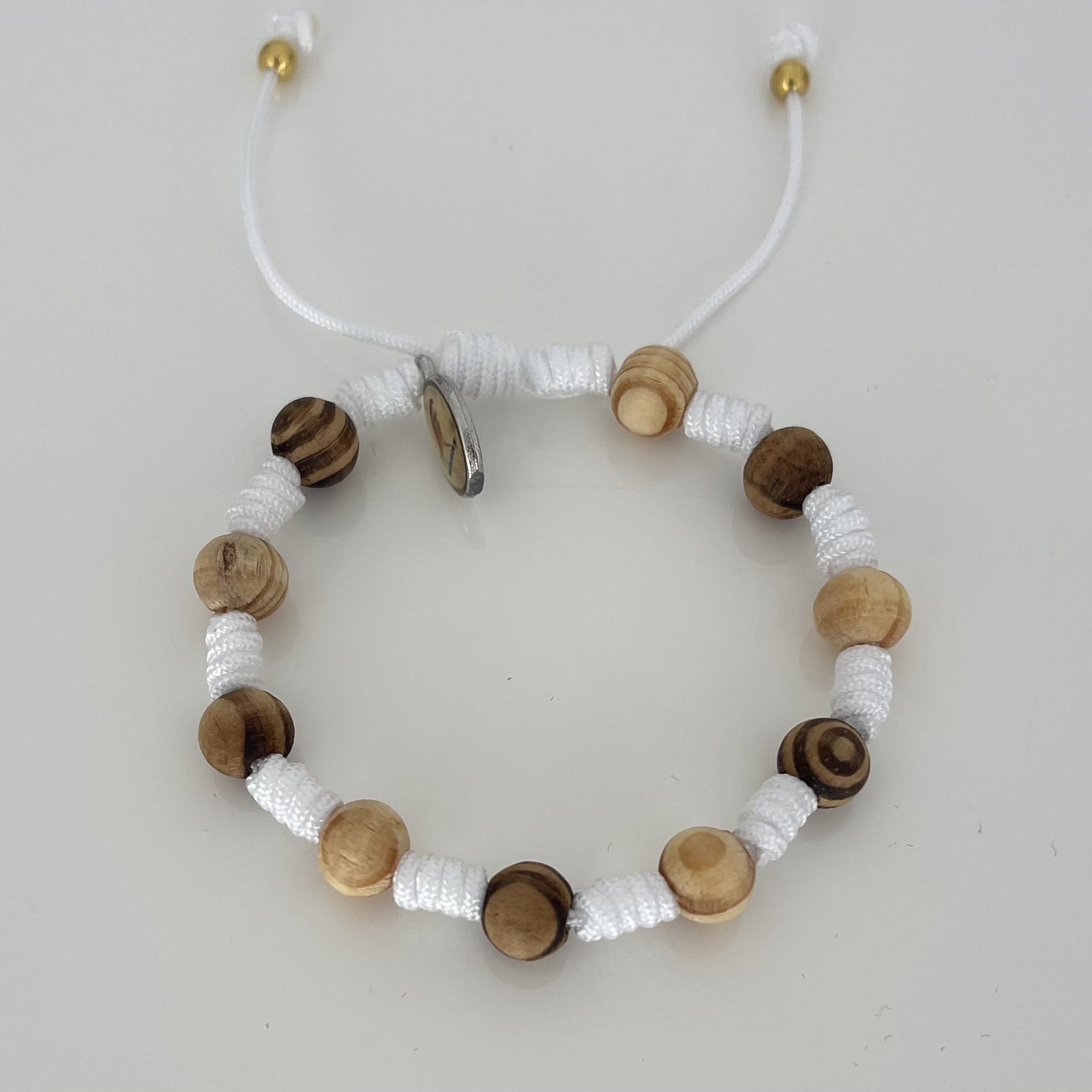 The beautiful bracelet from Međugorje. Each bracelet is handmade using olive beads with thread. Bracelet can be adjusted from 14 cm to 26 cm (5,5″ to 10″), and this size fits most.