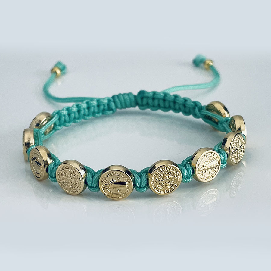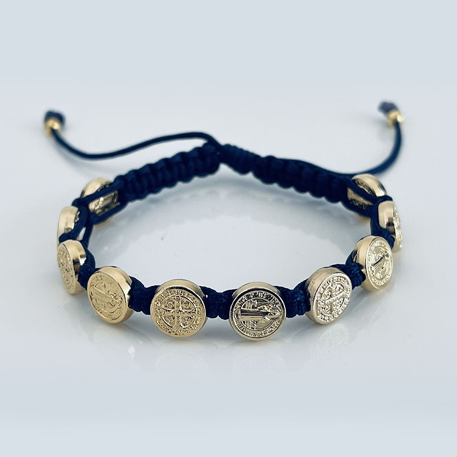 The beautiful bracelet from Međugorje. Each bracelet is handmade using 10 gold St. Benedict Italian beads. Bracelet can be adjusted from 14 cm to 26 cm (5,5″ to 10″), and this size fits most. This medal is your way to obtain God's blessings and protection through the intercession of St. Benedict.